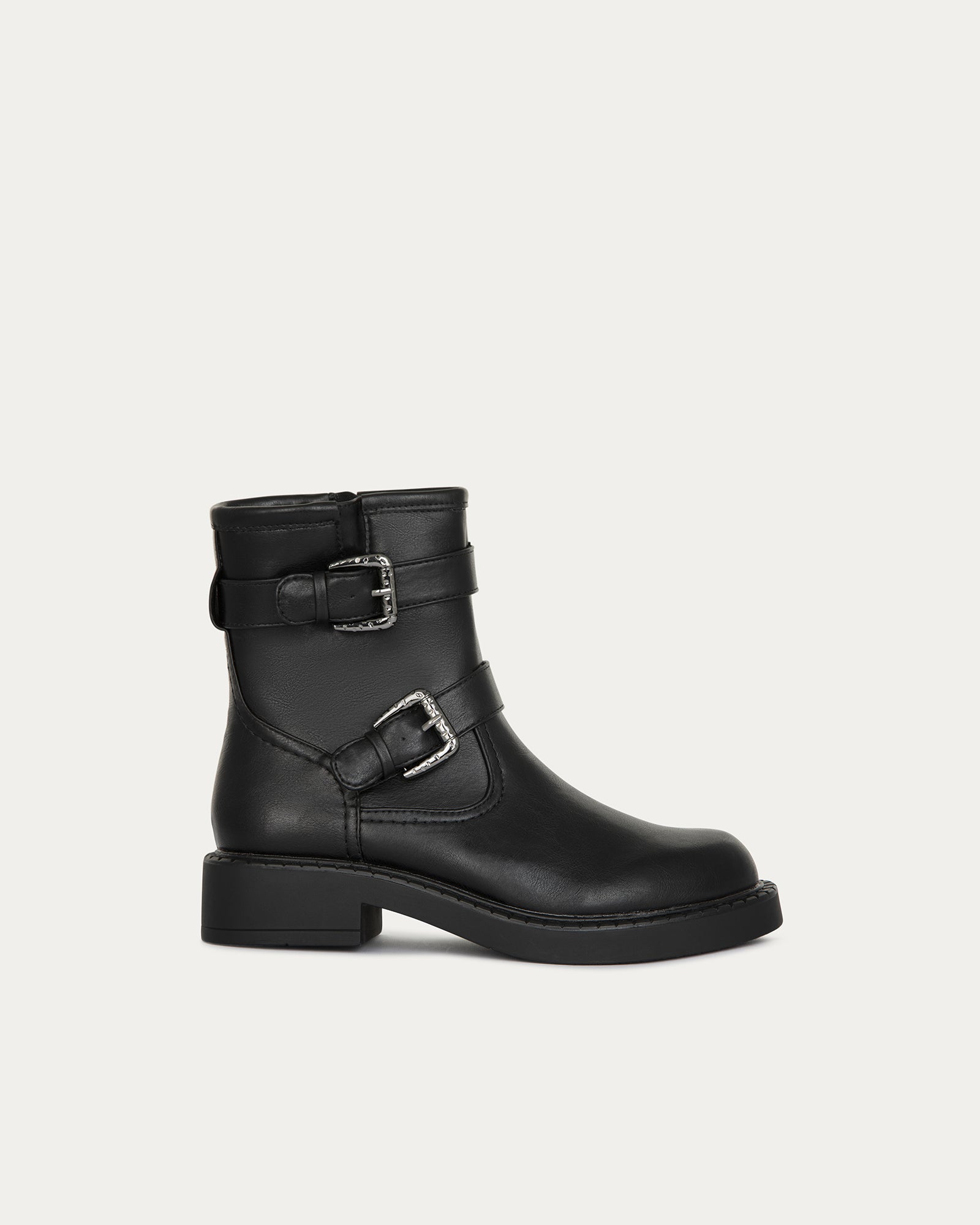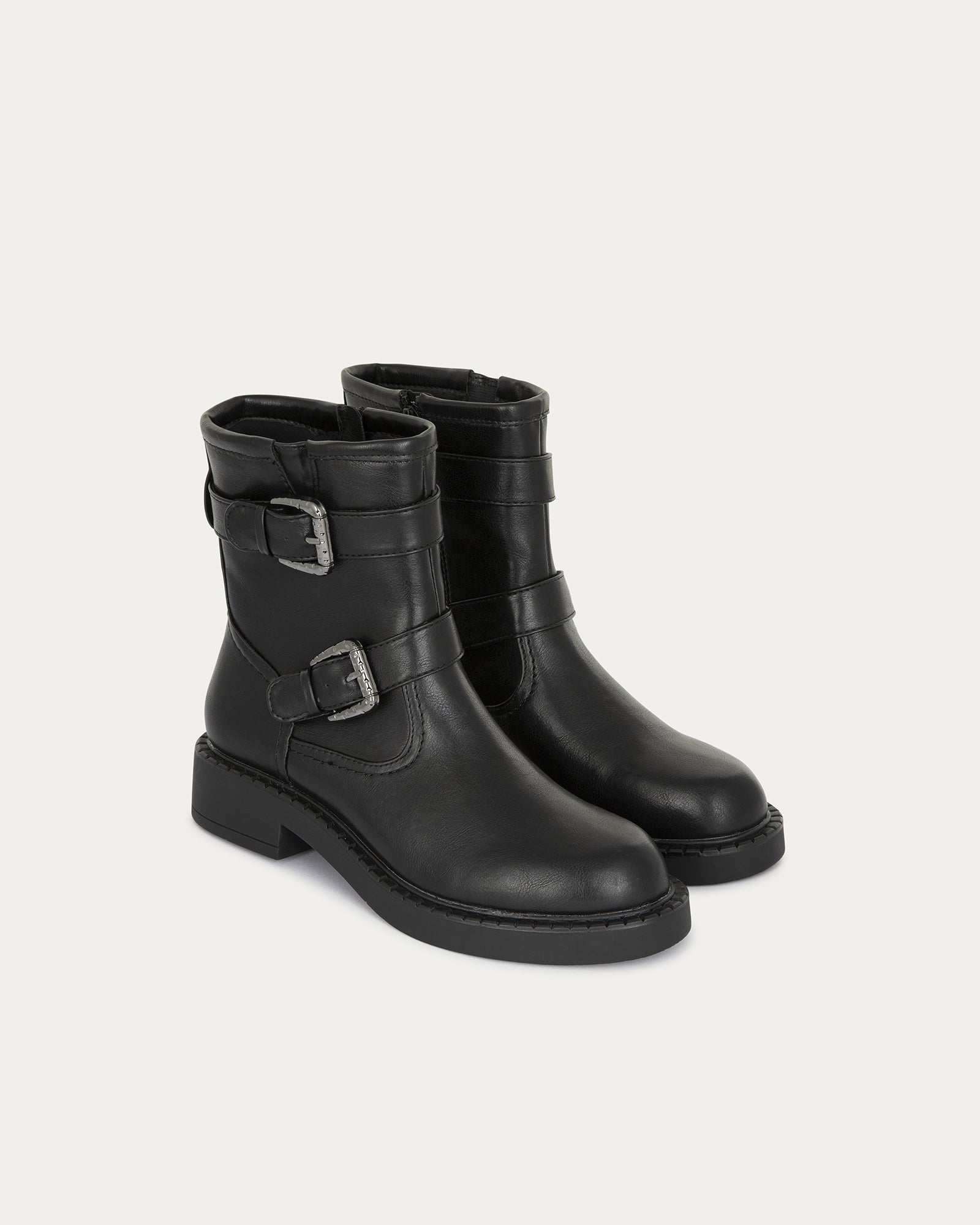 Elegant yet bold ankle boots with 2 buckle details and side zip for easy entry.
