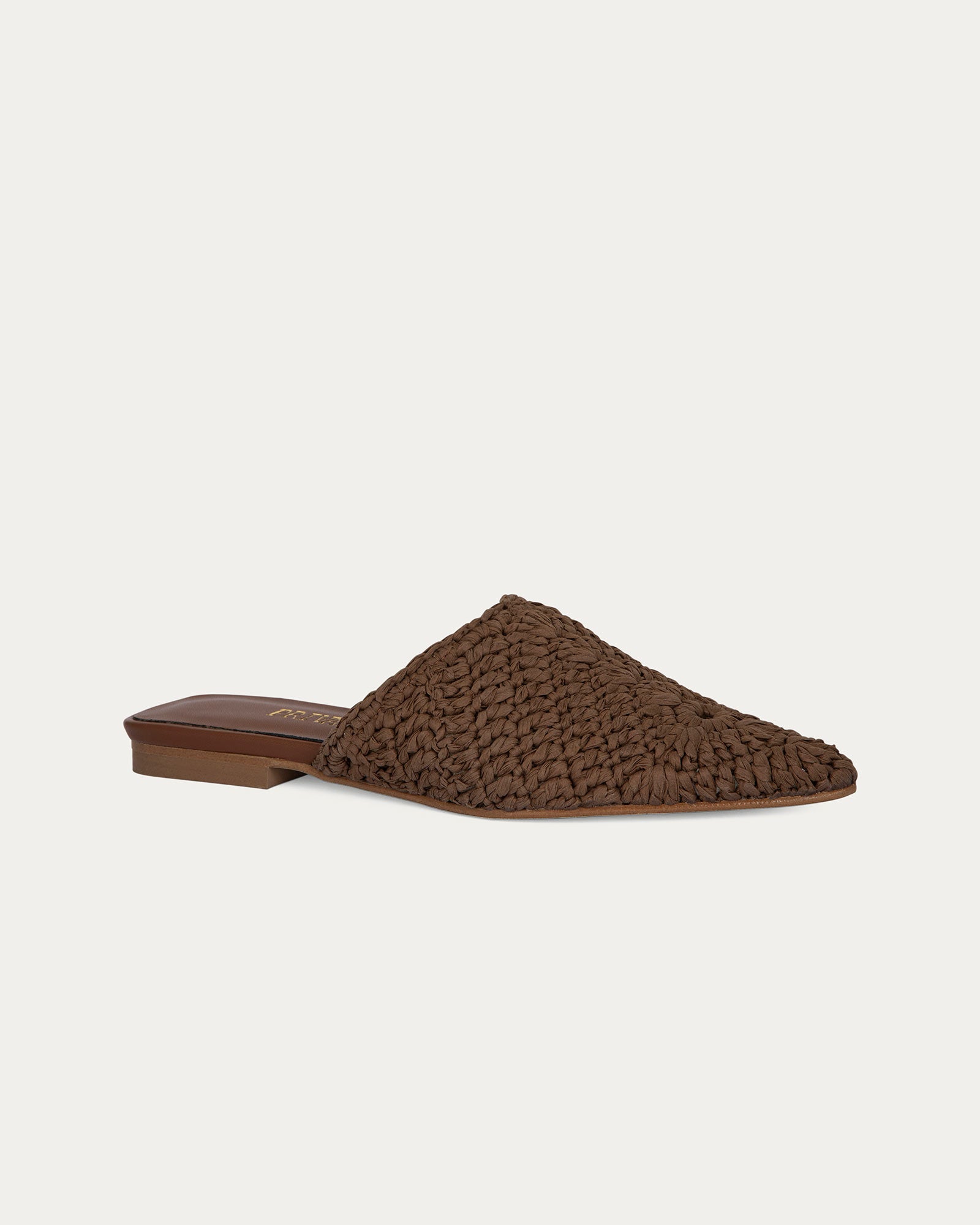 Low pointed sandals with macramé weave made of soft recycled material and raffia.