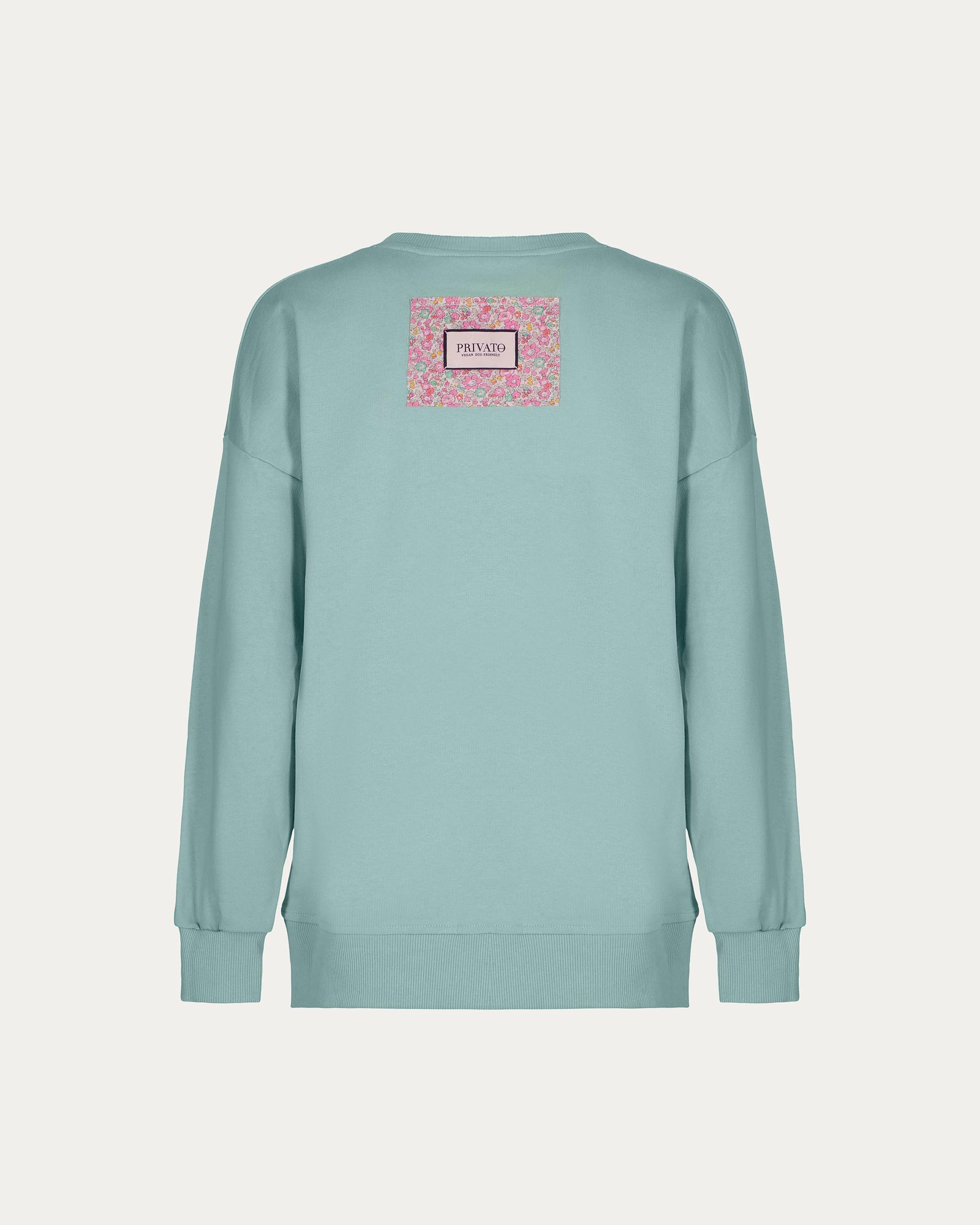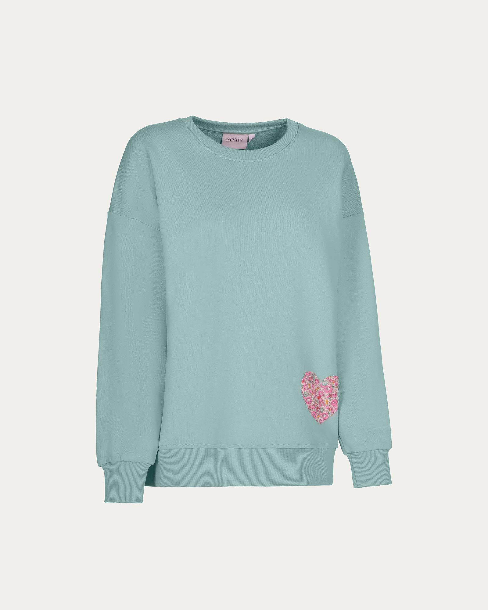 Sustainable vegan sweatshirt in 100% cotton with heart on the front in 100% Liberty cotton and organic cotton stitching.
