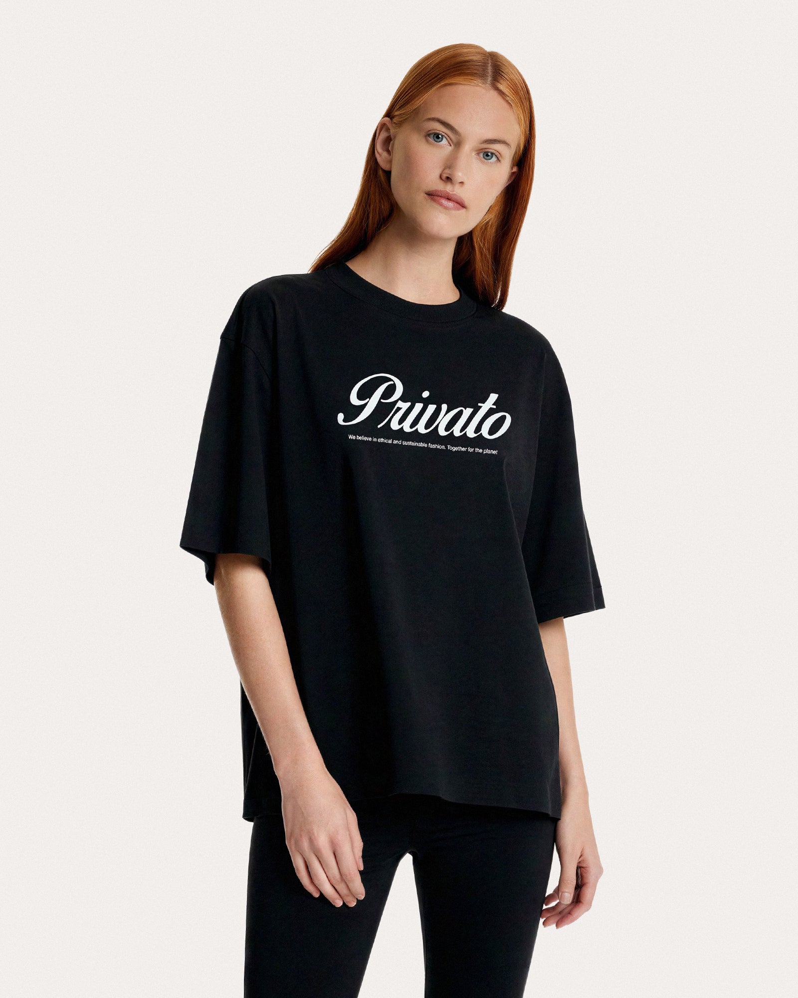Questa è una t-shirt statement che rappresenta perfettamente i valori e la filosofia del brand Privato, ideale per chi vuole comunicare il proprio impegno verso la moda sostenibile.