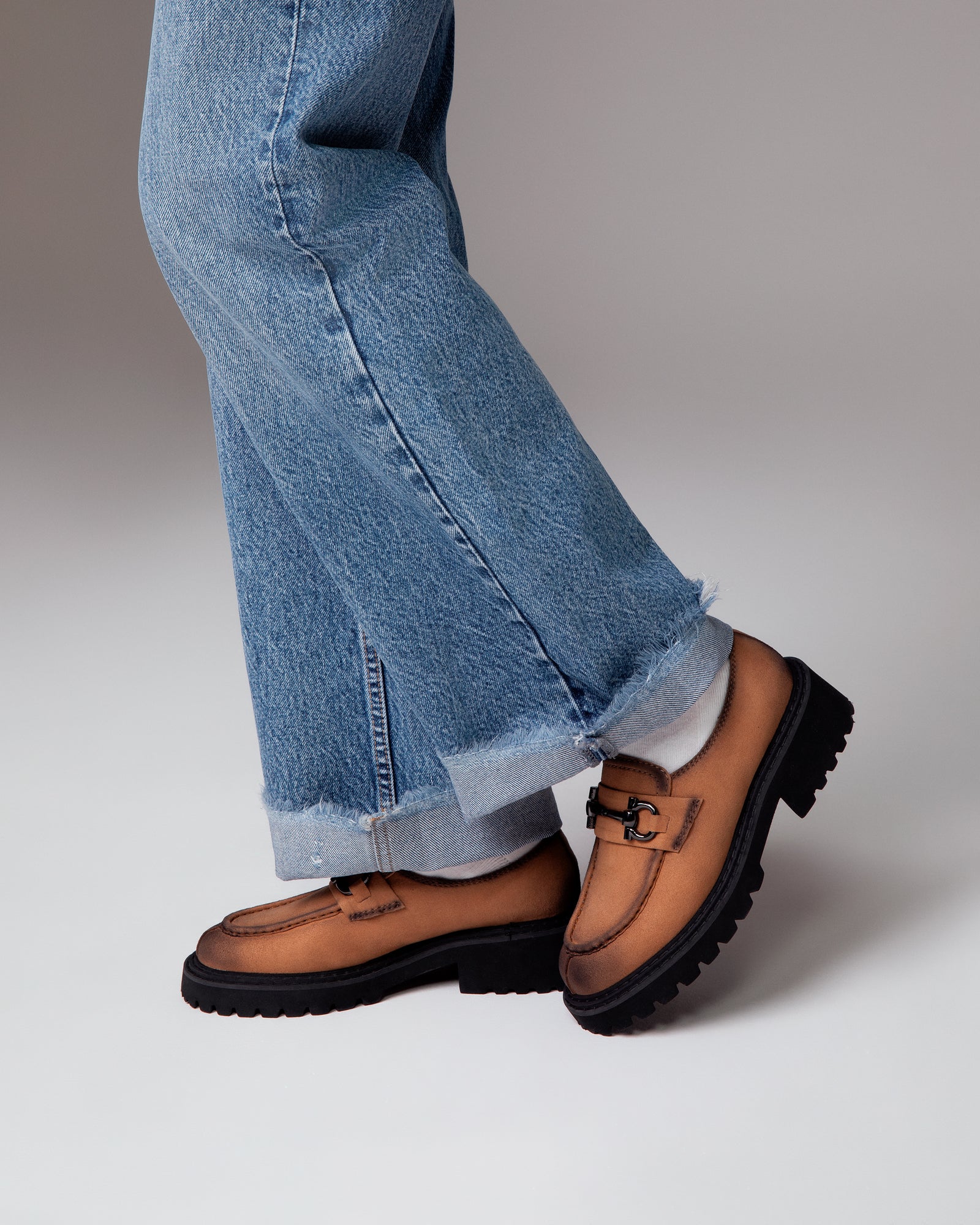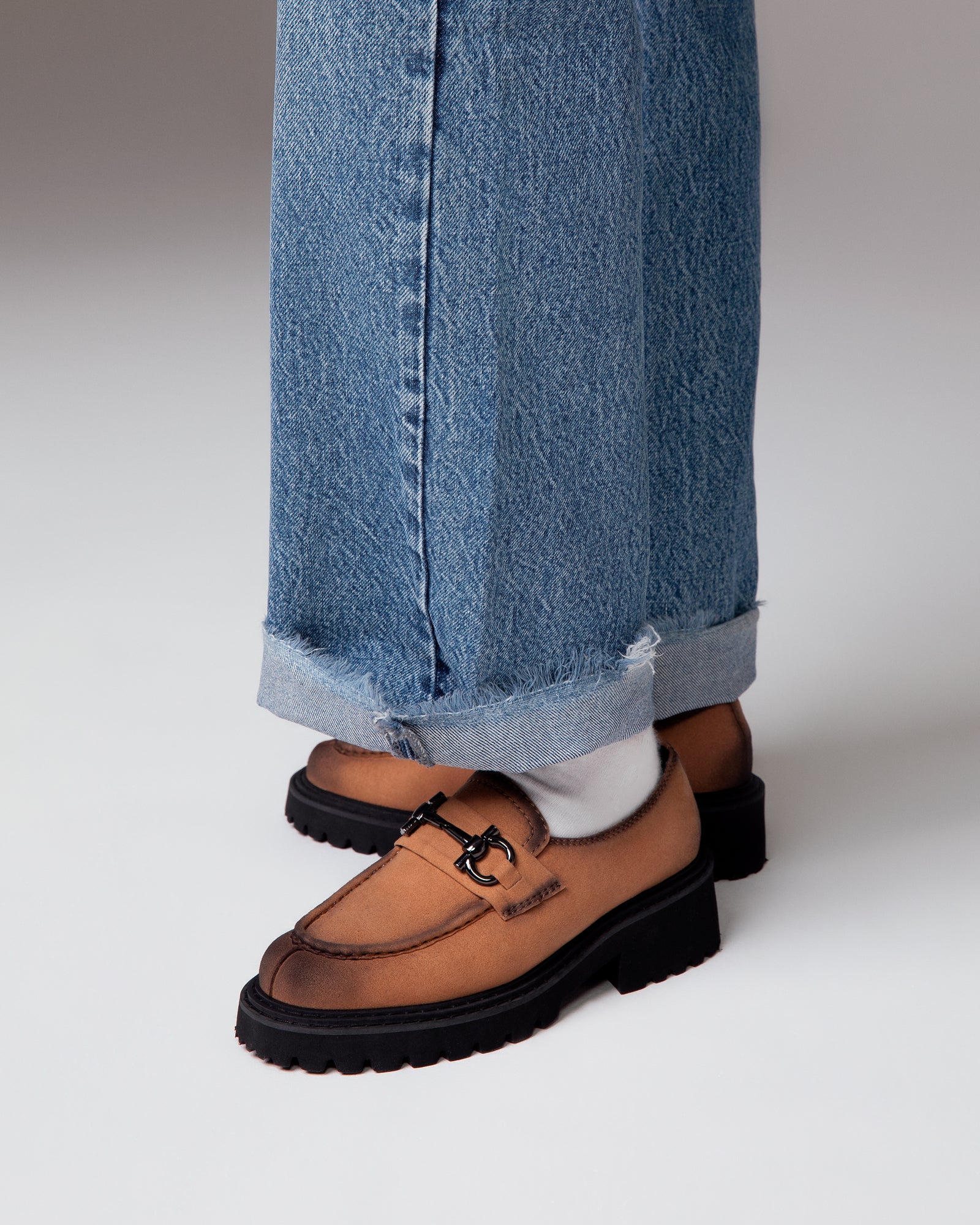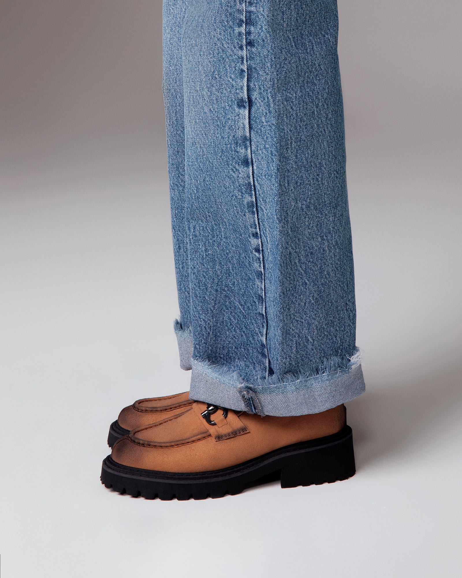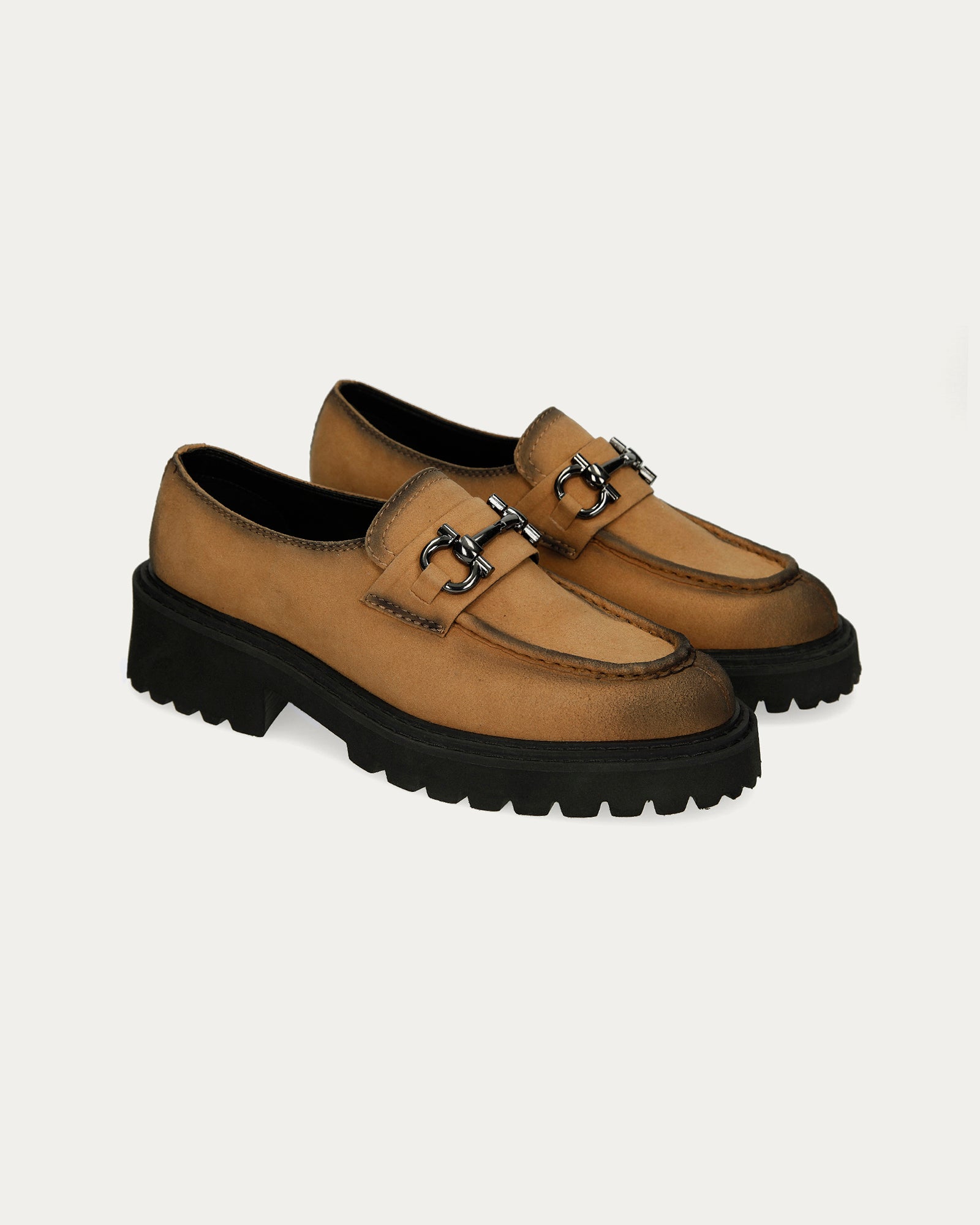 Mocassini leggeri color cammello opaco con accessorio morsetto lucido frontale.