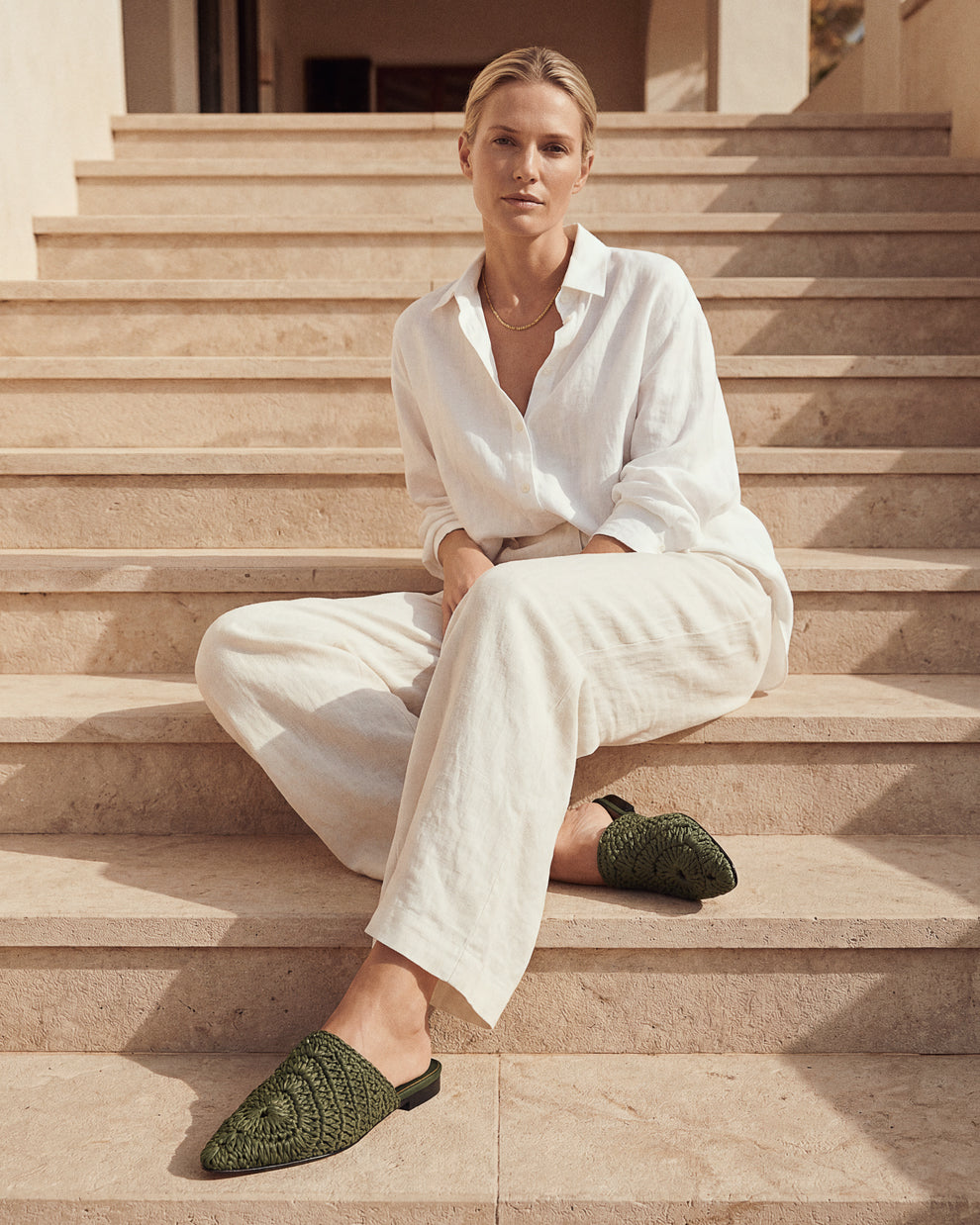 Sandali bassi a punta con intreccio macramè realizzati in morbido materiale riciclato e rafia.