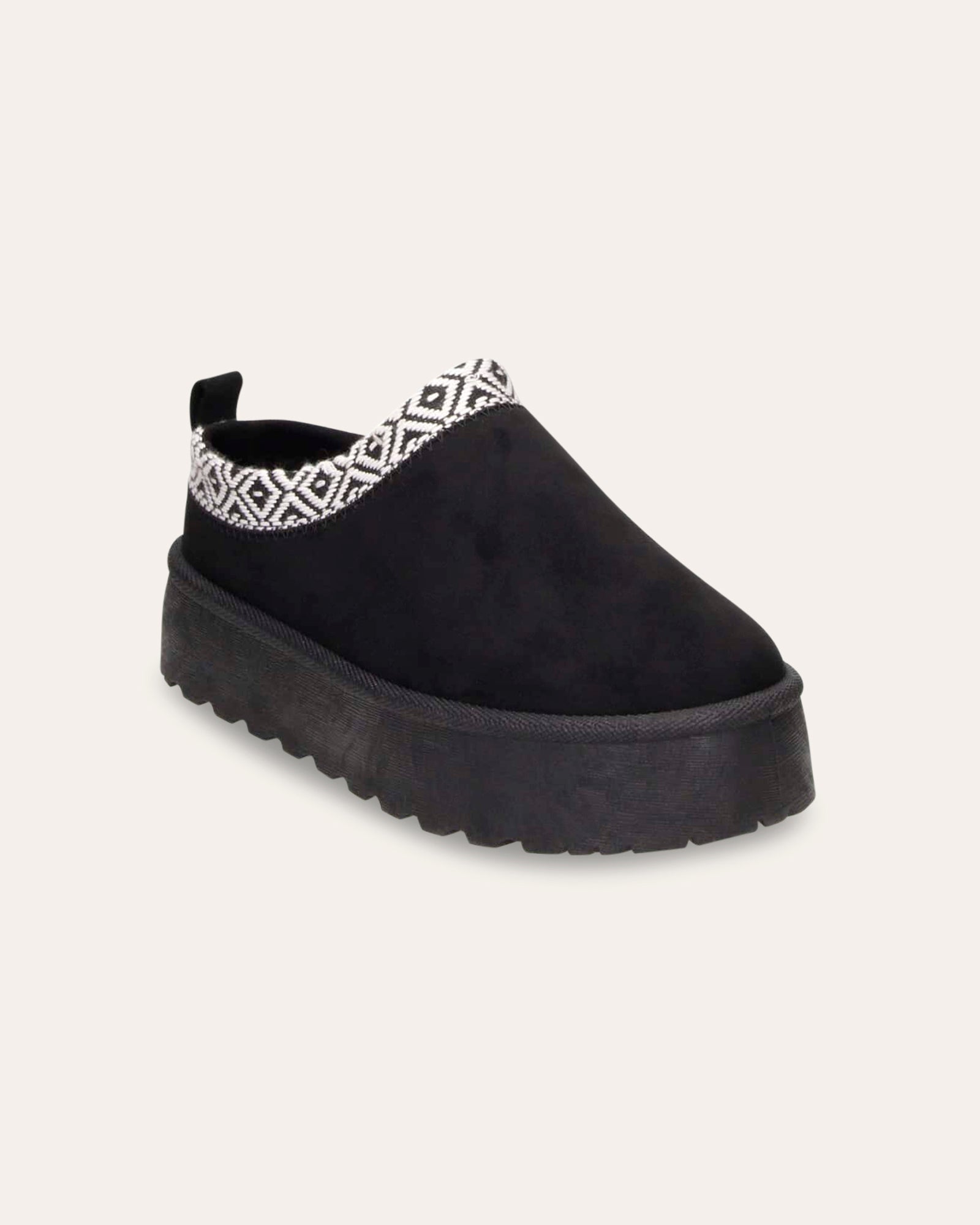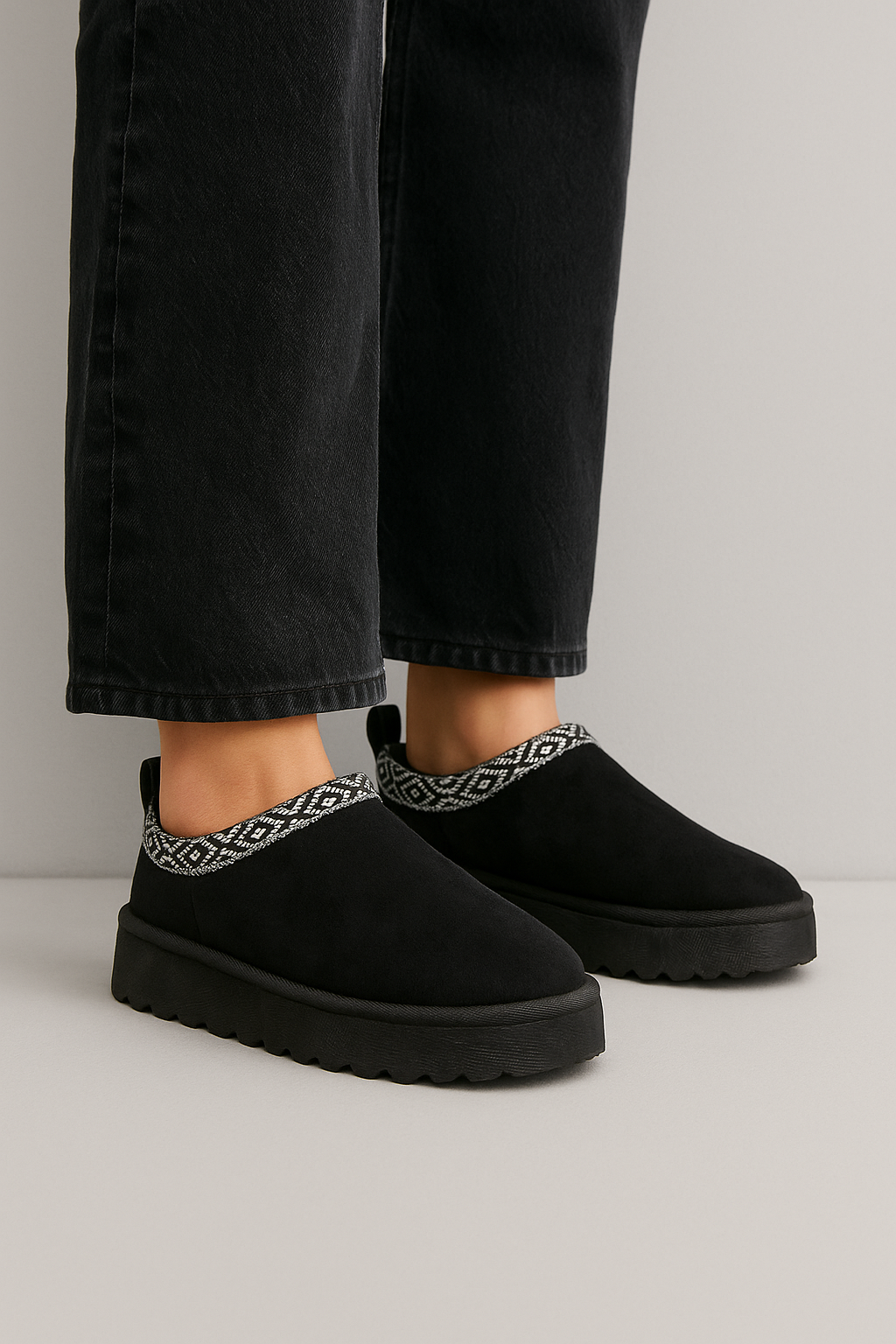 Slip-on impermeabili, morbidi e confortevoli con tomaia in effetto scamosciato color nero e fodera interna in eco-pelliccia calda e termoisolante.