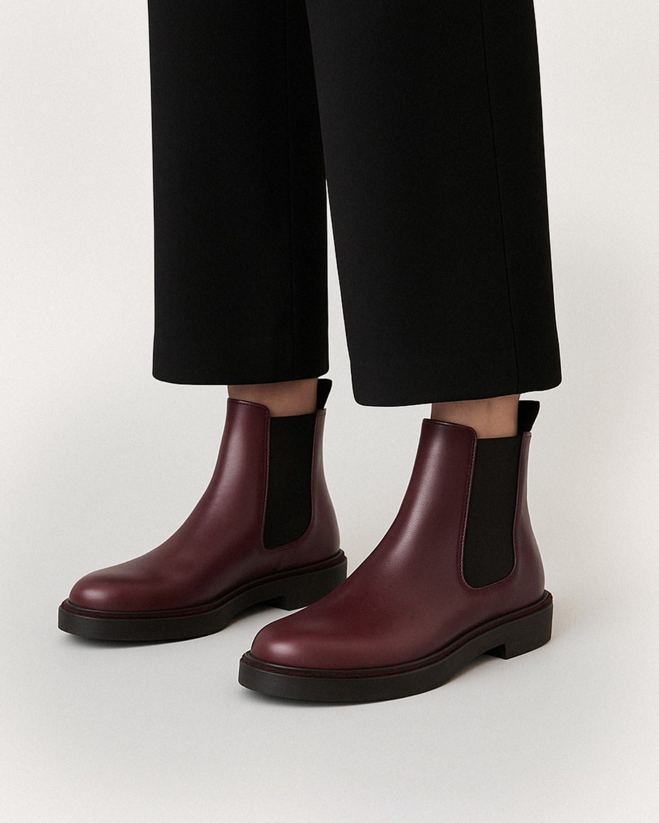 Stivaletti impermeabili in eco-pelle di colore bordeaux, impreziositi da elastici laterali neri che garantiscono una calzata comoda e una vestibilità ottimale.