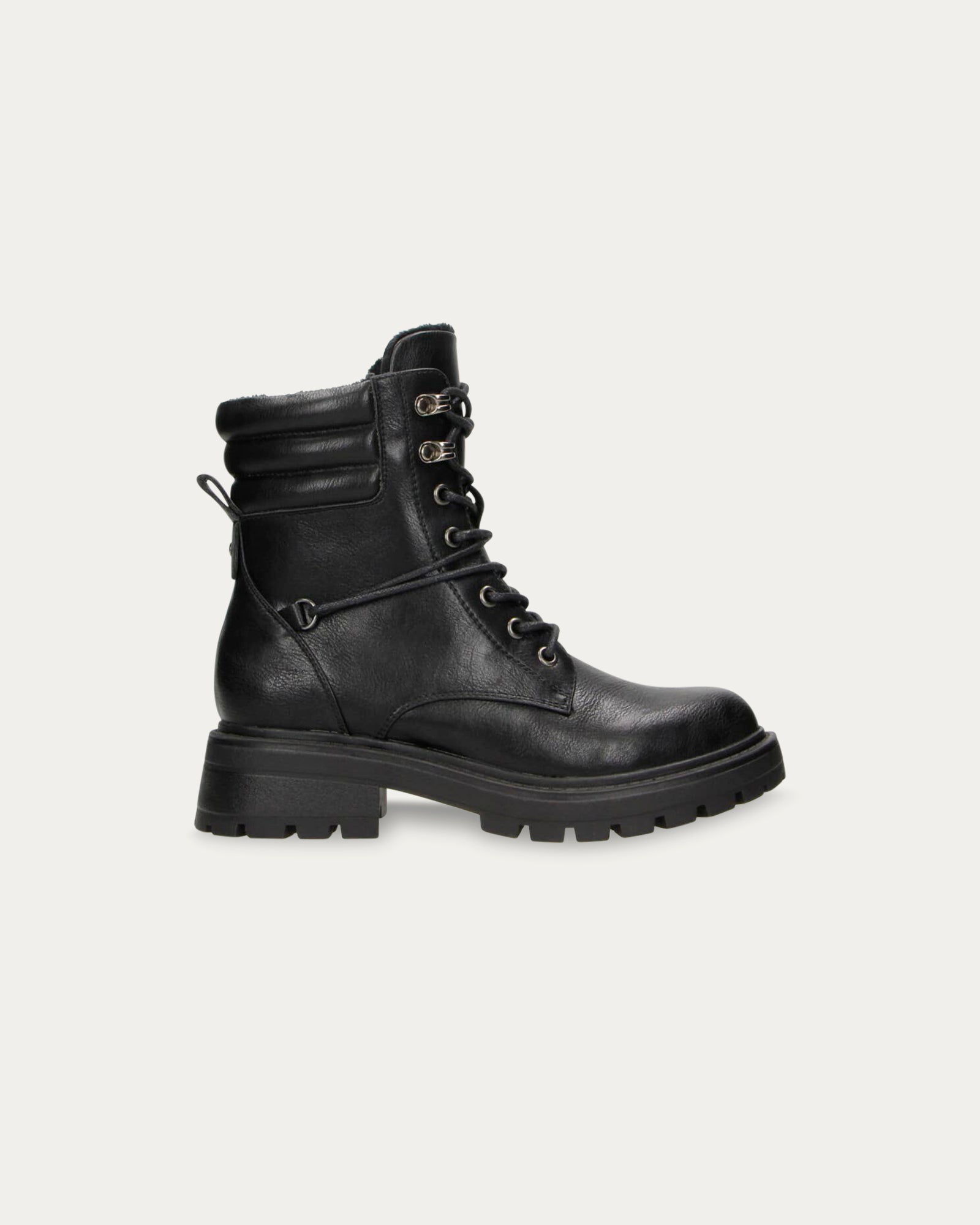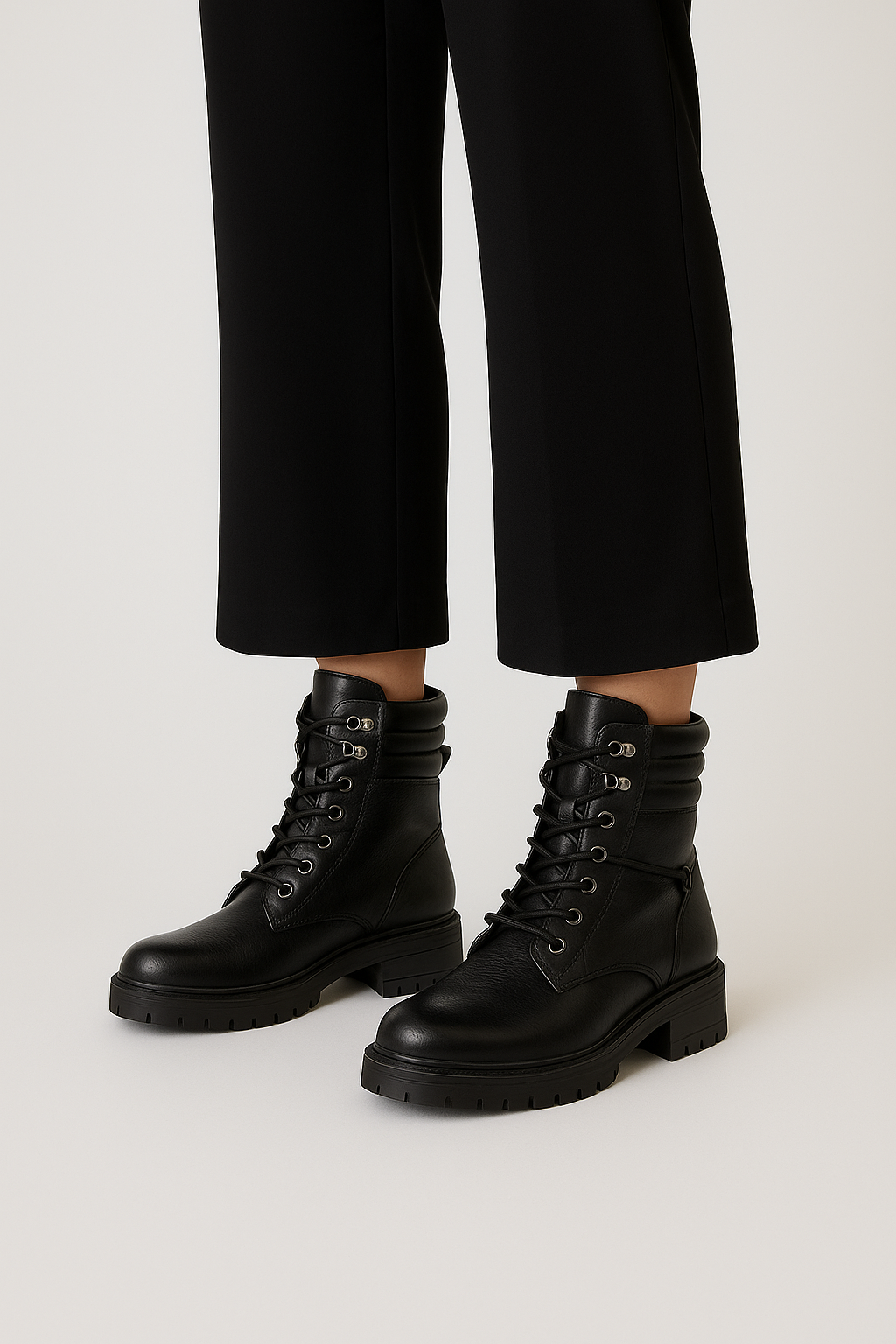 - Suola: Chunky in gomma nera con battistrada scolpito, altezza 4 cm