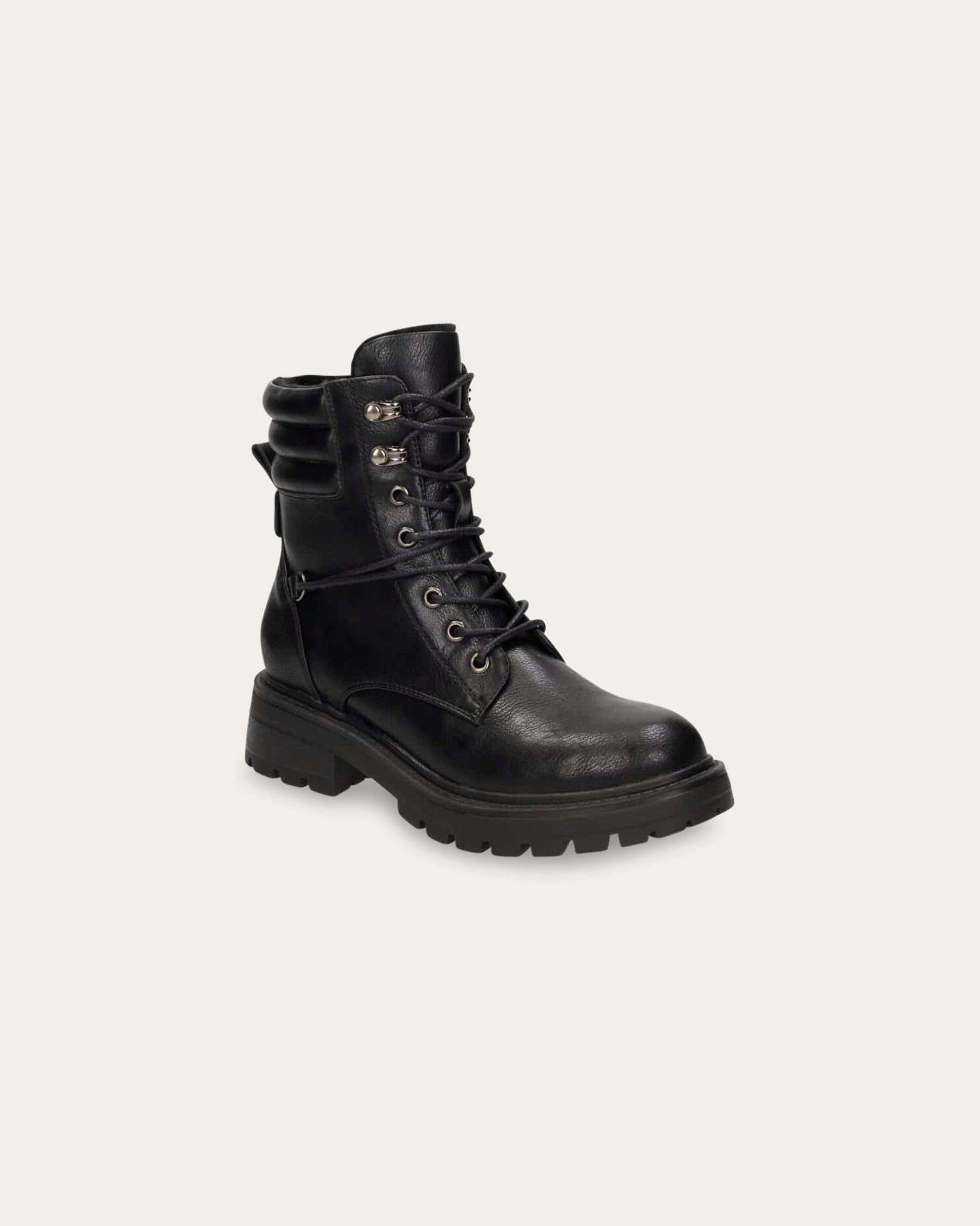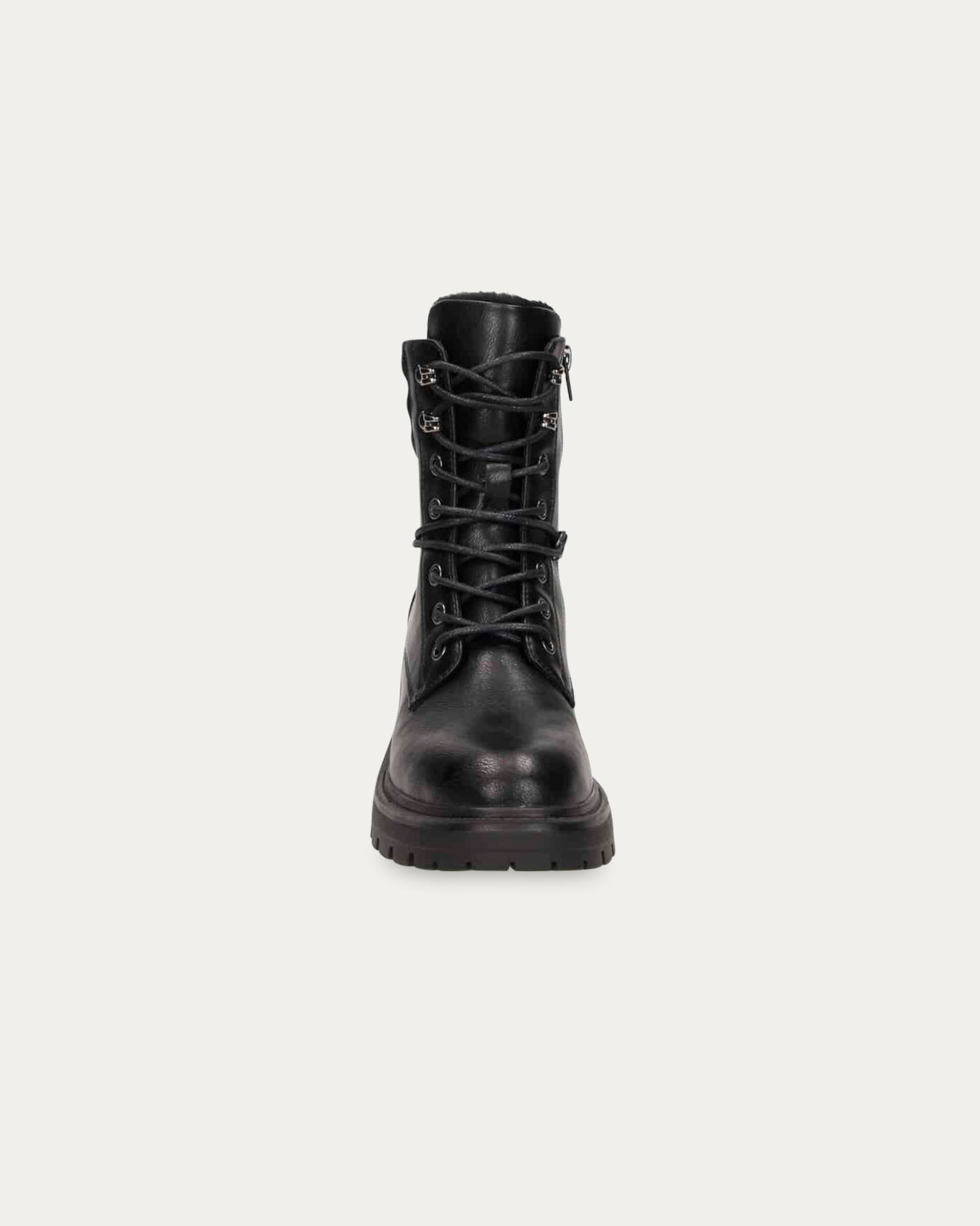 Stivali Combat impermeabili neri con fodera in eco-pelliccia calda e termoisolante, zip interna e dettagli metallici che ne esaltano il carattere urban-chic.